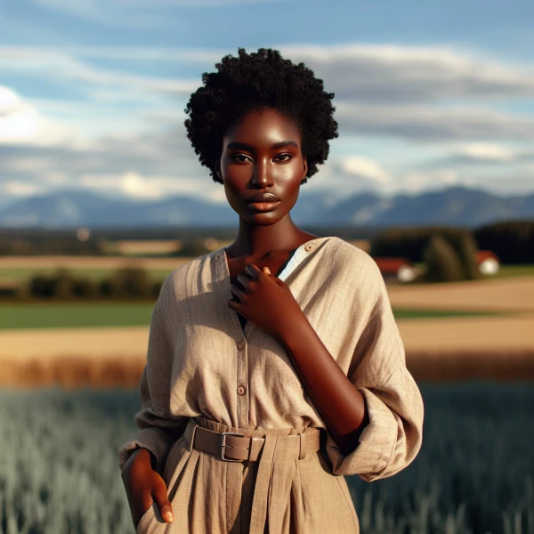 one stunning black woman, full body with natural look and natural hairstyle in the country